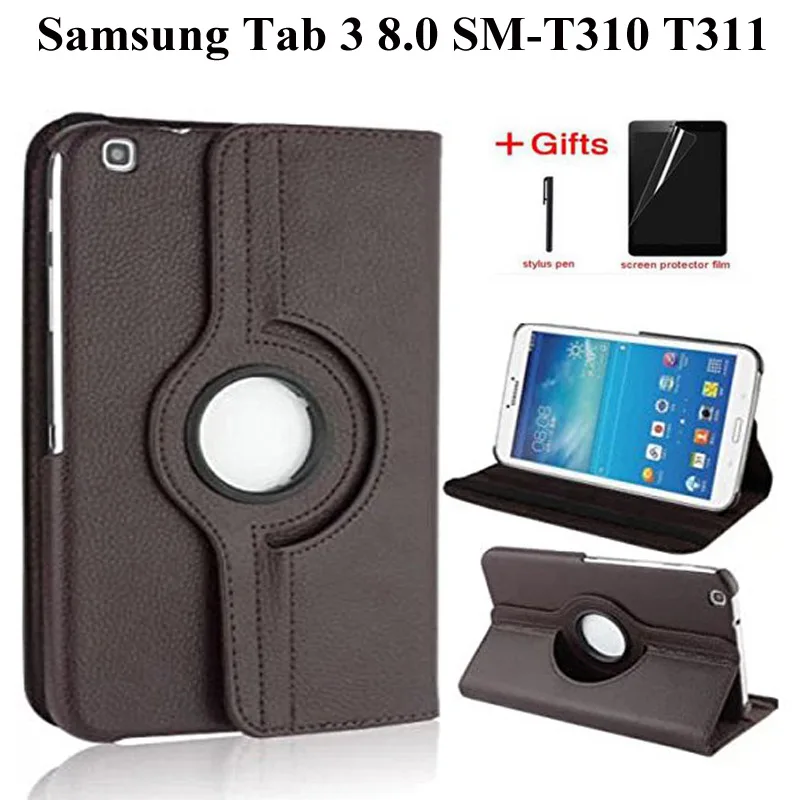 360 градусов вращающийся из искусственной кожи флип чехол для Samsung Galaxy Tab 3 8,0 T310 Крышка для Tab3 8,0 SM-T310/T311 чехол + Защитная пленка на экран + подста...