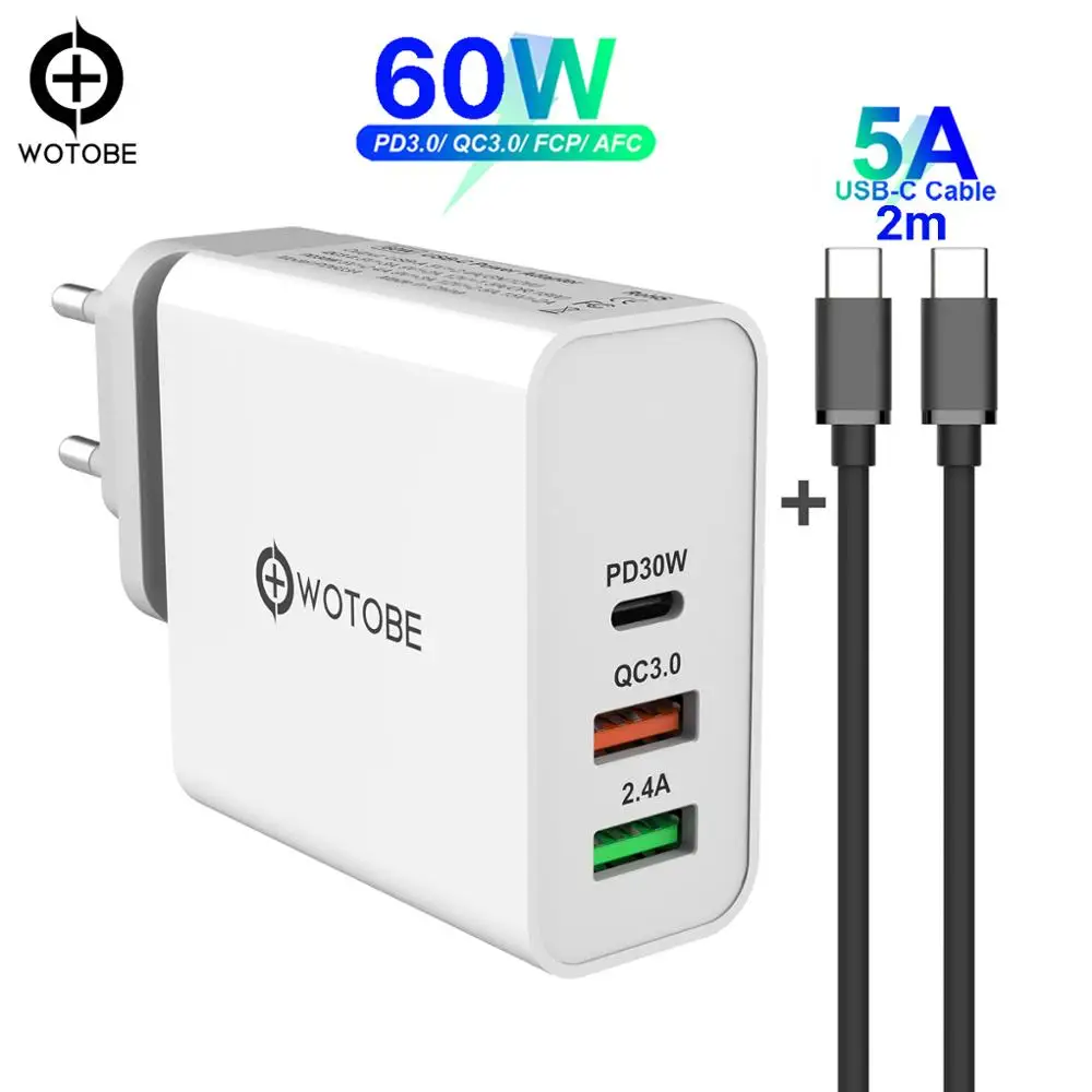 60 Вт TYPE-C USB-C зарядное устройство, PD30W QC3.0 зарядное устройство для USB-C ноутбуков MacBook Pro/Воздушный iPad Pro iPhone (Стандартный USB-C кабель)