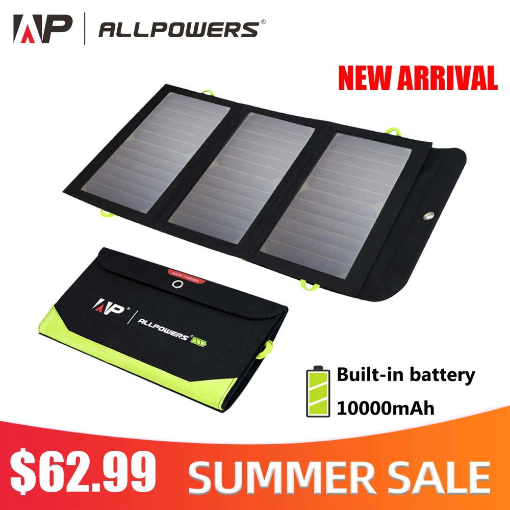 Зарядное устройство ALLPOWERS для солнечной батареи, 10000 мАч, встроенный аккумулятор, 5 В, 21 Вт, портативные солнечные батареи для iPhone 11X8 7, iPad, samsung, Xiaomi