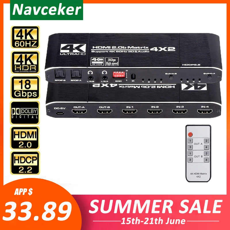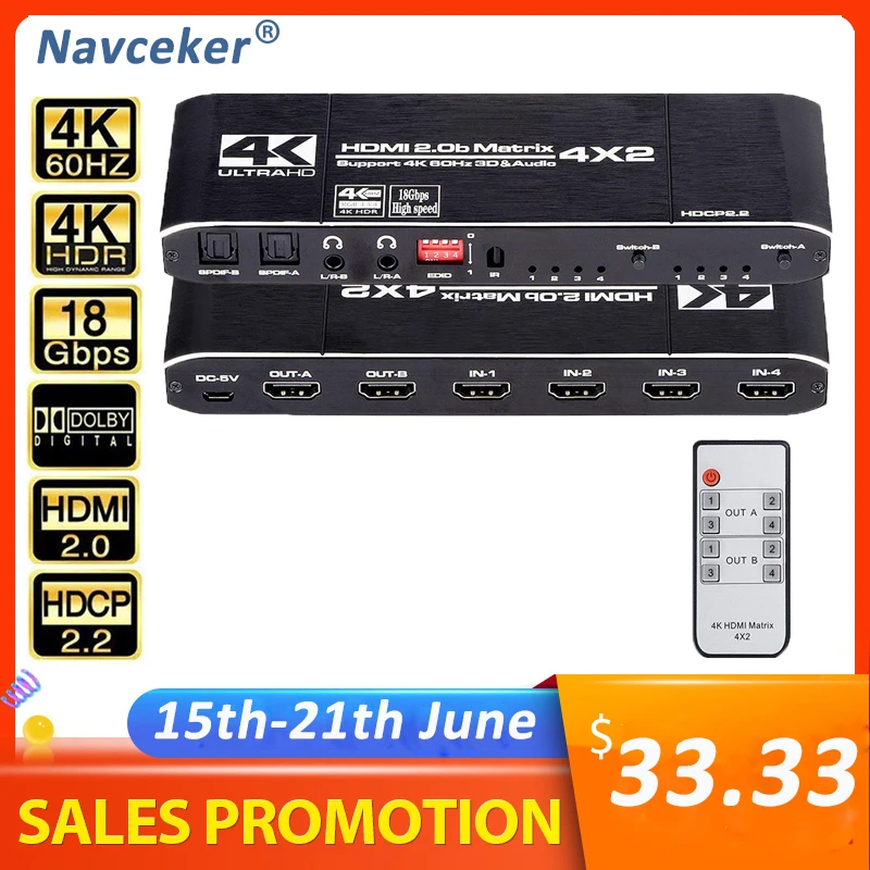 Navceker 18,5 Гбит/с HDMI матричный 4x2 4 k @ 60 Гц HDMI переключатель сплиттер с SPDIF и L/R 3,5 мм HDR HDMI коммутатор 4x2 Поддержка HDCP 2,2 3D