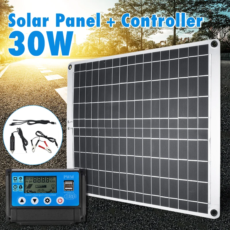 30 Вт солнечные панели из кремня с Автомобильное зарядное устройство + 10/20/30/40/50A регулятор контроллер для автомобиля светодиодный свет 12 В ба...