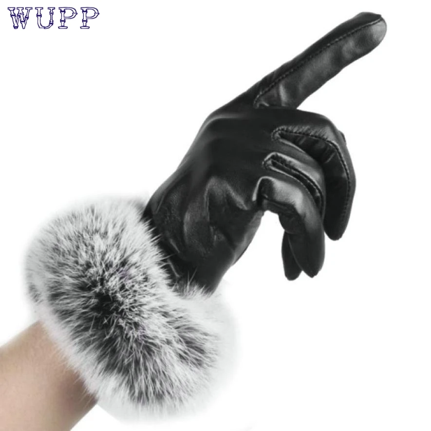 Для женщин женские кожаные перчатки осень-зима теплый мех кролика варежки вождения Удобная Байкерская велосипедные перчатки зима теплая #...