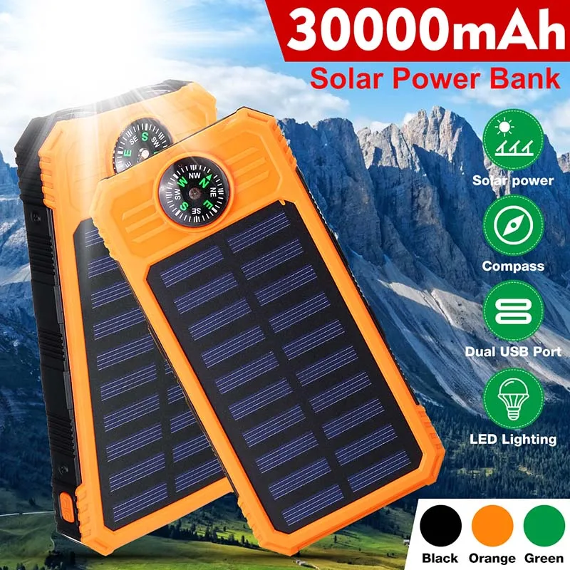30000 мАч Солнечное зарядное устройство, водонепроницаемое солнечное зарядное устройство, 2 Usb порта, Внешнее зарядное устройство для путешествий, зарядное устройство с компасом, светодиодный светильник
