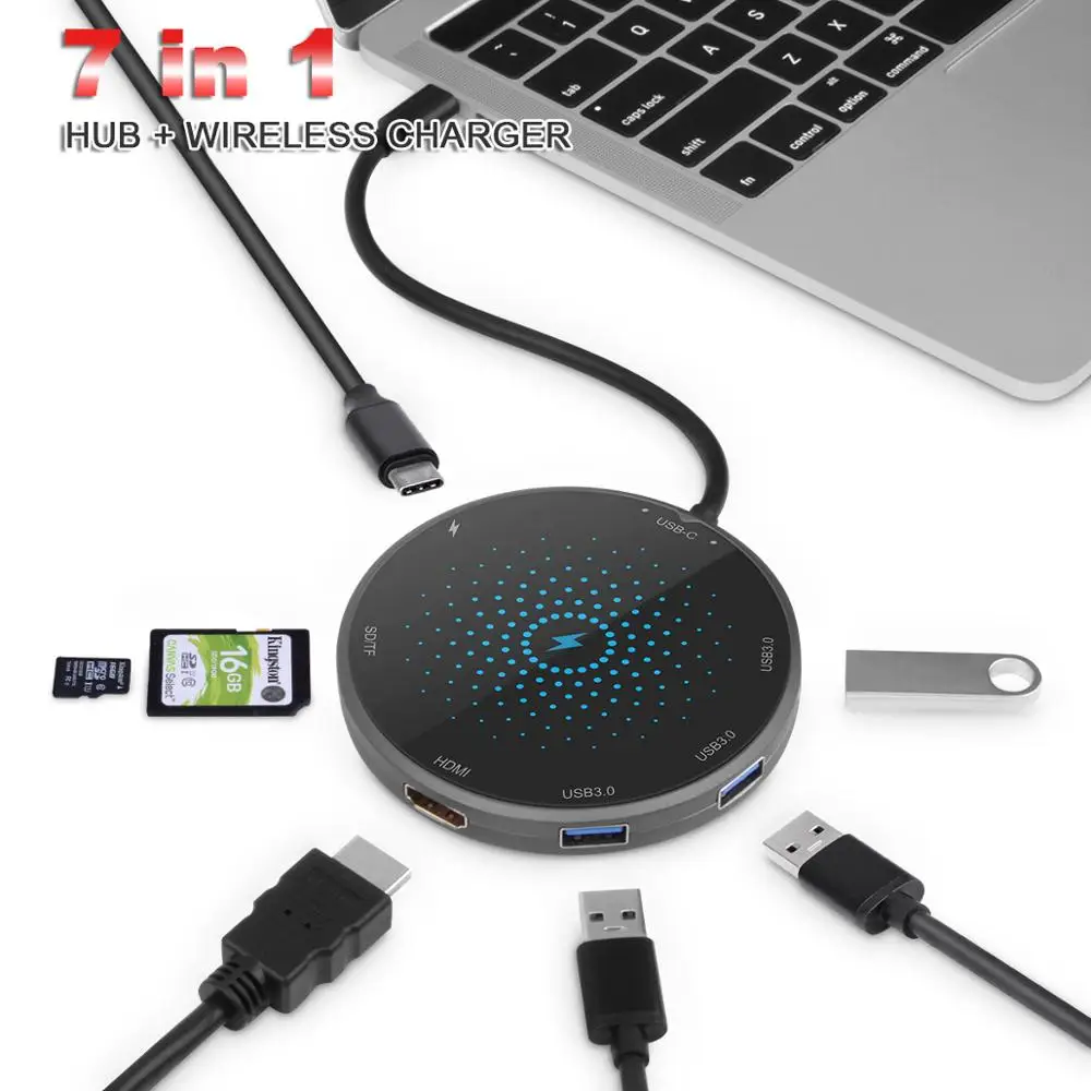 7 в 1 Type-C концентратор (HDMI + 3 порта USB3.0 + SD + TF + PD интерфейсы) док-станция с 10 Вт беспроводным зарядным устройством USB-C концентратор