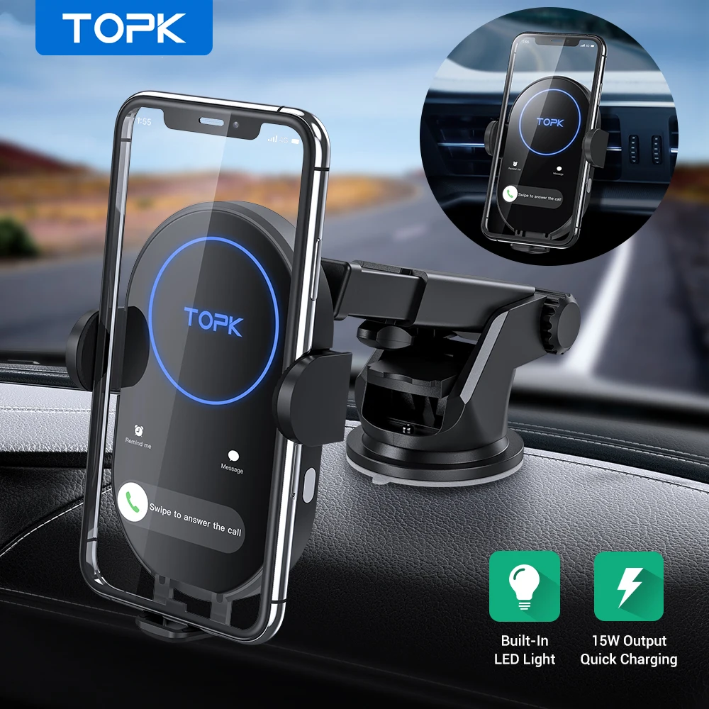 Беспроводное Автомобильное зарядное устройство TOPK для iPhone 11, samsung, Xiaomi, 15 Вт, Индукционное автомобильное крепление, быстрая Беспроводная зарядка, автомобильный держатель для телефона