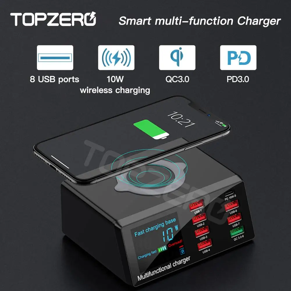 TOPZERO 100W Wireless USB Charger Dock 18W PD QC3.0 Fast Charge Station Smart LED Display 8 Ports USB Adapter For Android iPhone
