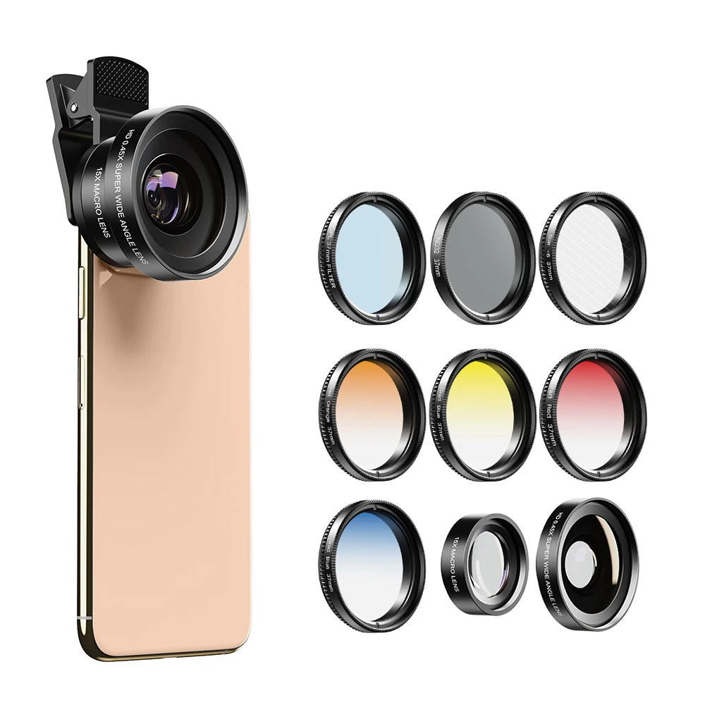 APEXEL 9в1 37 мм градиентный фильтр для объектива 0,45x Широкий + 15x макрообъектив градиентный Синий Красный Цветной фильтр + CPL + ND + Звездный фильтр для телефонов