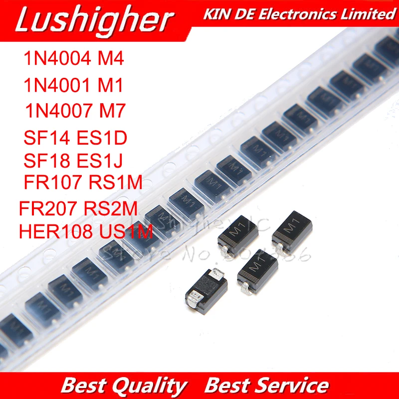 100 шт Диод выпрямителя 1N4001 M1 1N4004 M4 1N4007 M7 FR107 RS1M SMA FR207 RS2M HER108 US1M SF18 ES1J SF14 ES1D DO-214AC
