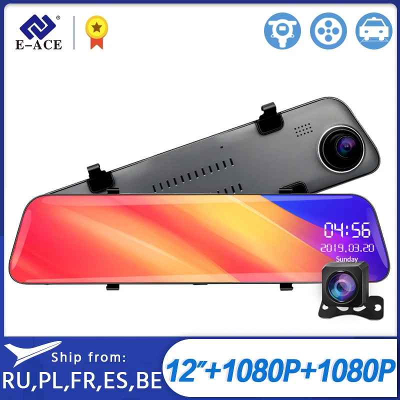 Автомобильный видеорегистратор с сенсорным экраном и зеркалом заднего вида, 12 дюймов, Full HD 1080P, автомобильная камера, видеорегистратор с двумя объективами, E-ACE A39
