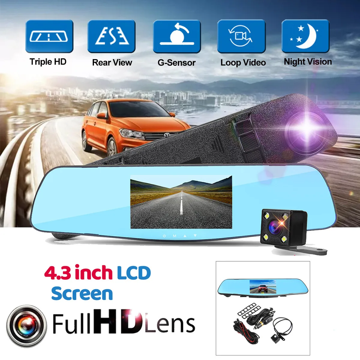 4,3 дюймов 1080P Автомобильный видеорегистратор с двумя объективами камера Fhd Автомобильное зеркало заднего вида для вождения автомобиля видеорегистратор камера с изображением заднего вида автомобиля