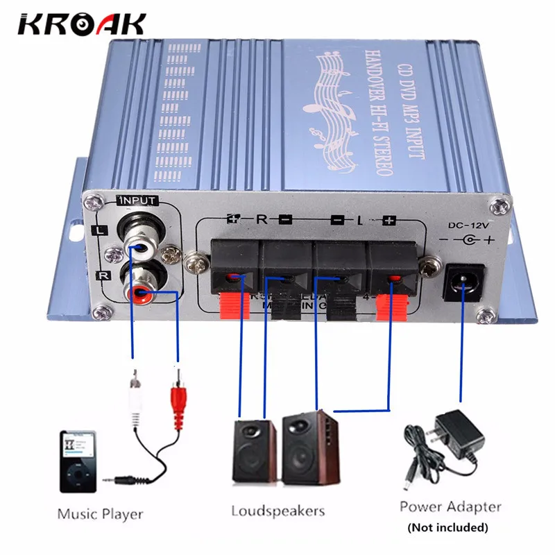 KROAK Мини 20 Вт * 20 HiFi стерео аудио усилители домашние AMP для автомобиля MP3 FM радио лодка 2 Cananal Стерео DVD, динамик синий и красный цвета