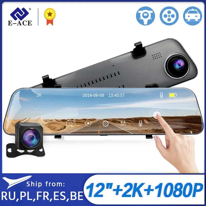 E-ACE A38 2K Автомобильный видеорегистратор 12 дюймов сенсорный IPS зеркало заднего вида двойной объектив Dashcam Автомобильная камера g-сенсор видеорегистратор с объективом заднего вида