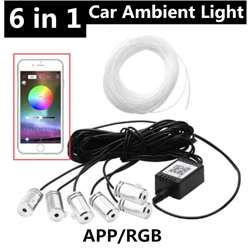 6 в 1 RGB Светодиодные полосы окружающий свет приложение Bluetooth управление для салона автомобиля Атмосфера свет лампы DIY музыка волоконно-оптический ремешок