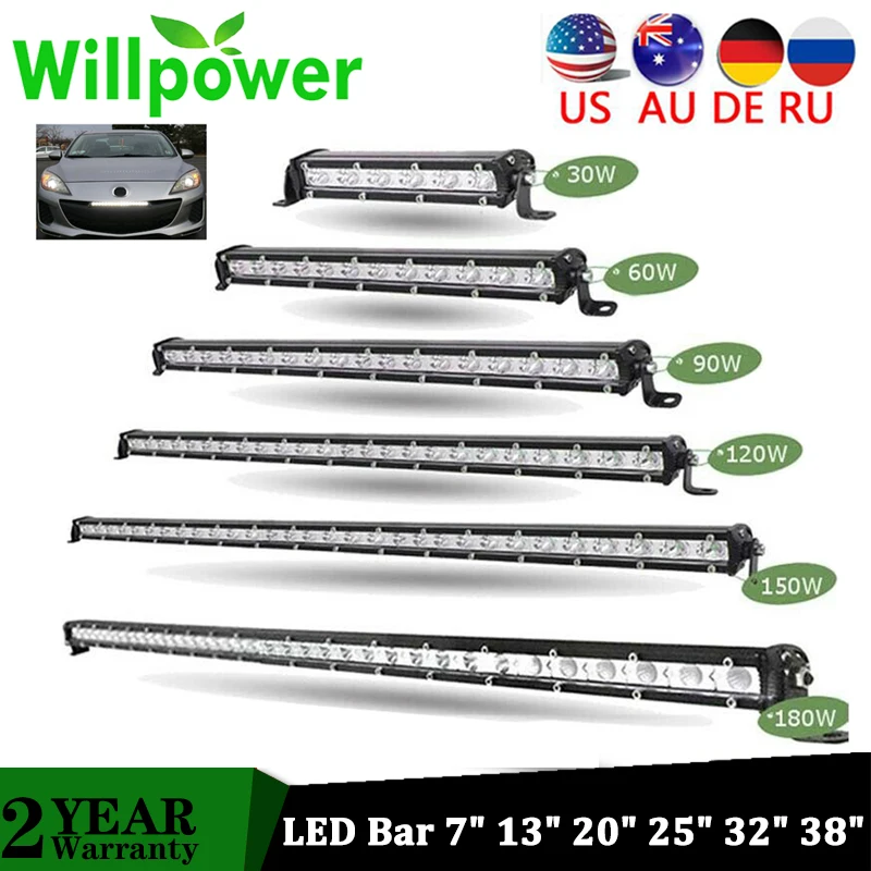 Супер яркий Однорядный тонкий светодиодный светильник-бар 90 Вт 120 Вт 150 Вт 180 Вт 60 Вт 7 "13" 20 "25" 32 "38" для SUV 4X4 ATV внедорожный рабочий светильник