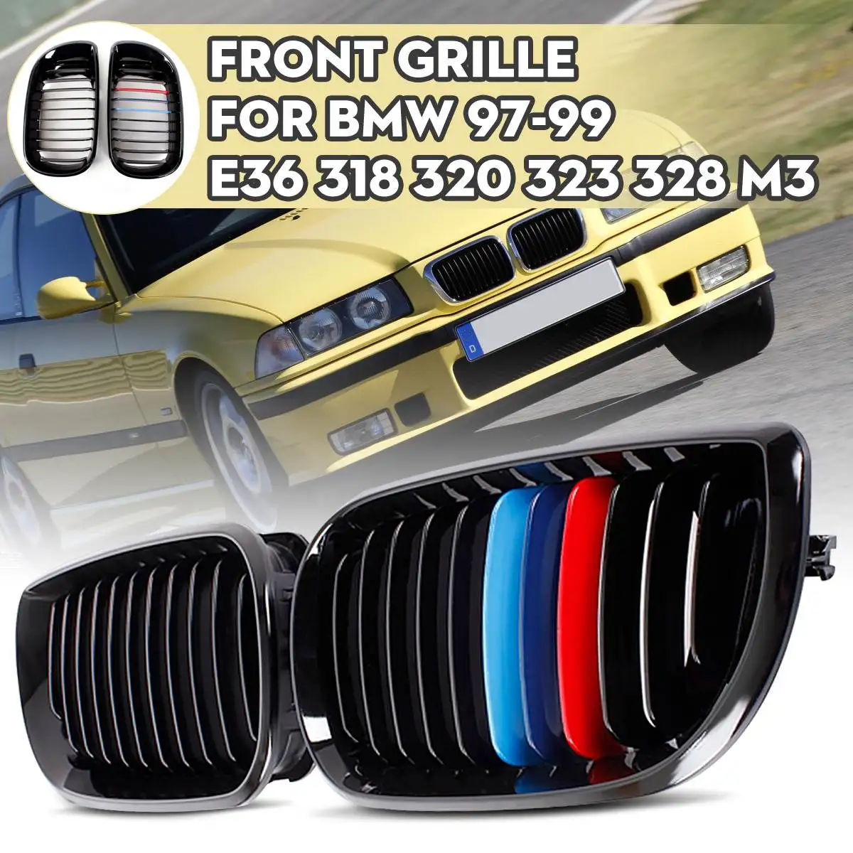 Pair Front Kidney Grille Grill Gloss Black M Style For BMW E36 3 Series M3 318 328 1997 1998 1999 Racing Grills