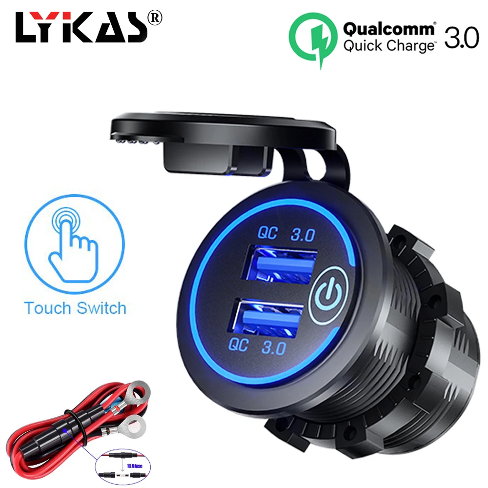 LYKAS QC 3,0 Автомобильное зарядное устройство с двумя usb-разъемами и выключателем, сенсорный светодиодный светильник, водонепроницаемое автомобильное USB зарядное устройство для телефона 5 в А