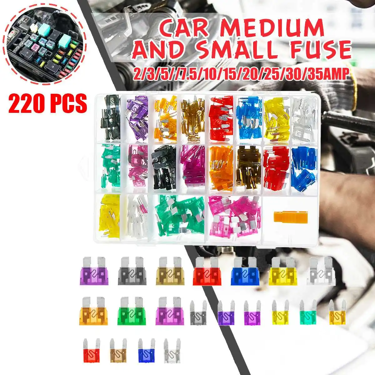 220 шт. Мини Стандартный Авто Лезвие предохранители автомобиль грузовик двигатель Ван предохранитель набор 2/3/5/7,5/10/15/20/25/30/35 Ампер с коробкой клип ассортимент