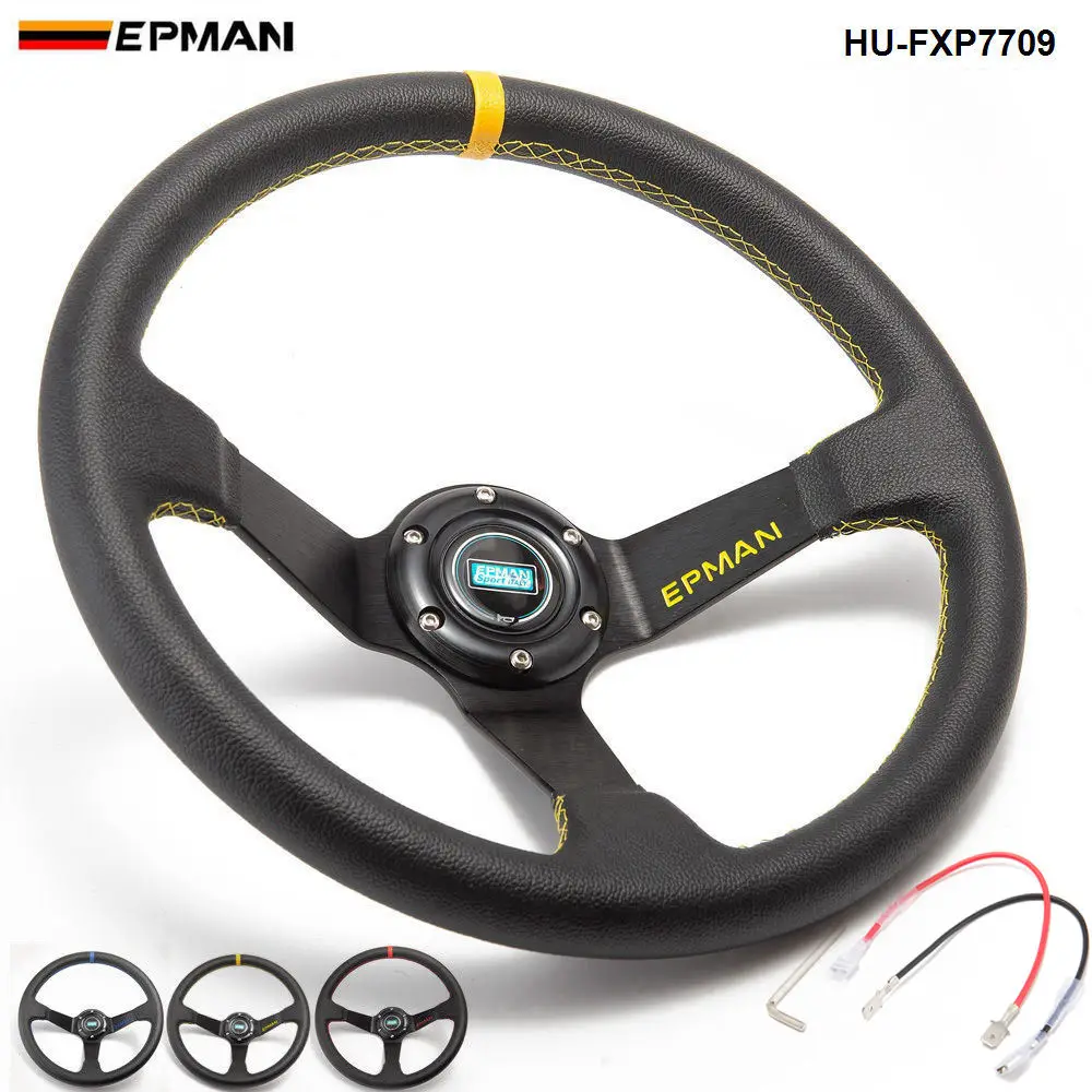Универсальный 350 мм черная кожа ПВХ желтый Deep Dish рулевого колеса с роговыми пуговицами HU-FXP7709