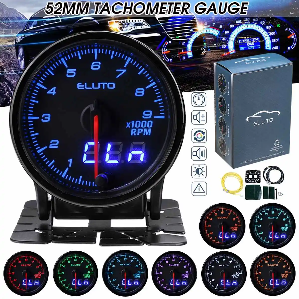Eluto Универсальный 2 дюймов 52 мм Автомобильный Тахометр измеритель оборотов цифровой и индикатор Pin двойной дисплей 10 цветов светодиодный с Тонировкой лица Tach
