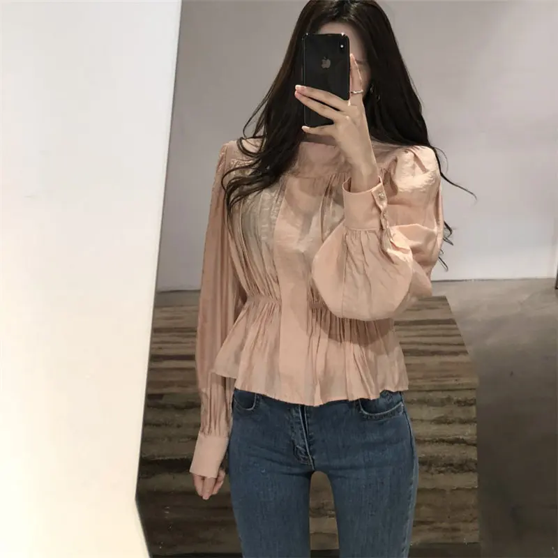 Элегантные женские весенние блузки с оборками и круглым вырезом, с длинным рукавом, офисные женские повседневные корейские Топы 2020 SJ3682E