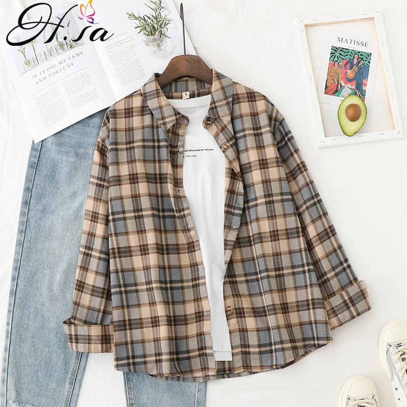 Женская клетчатая блузка с длинным рукавом H. SA, винтажные свободные весенние топы с отложным воротником, Весенняя верхняя одежда