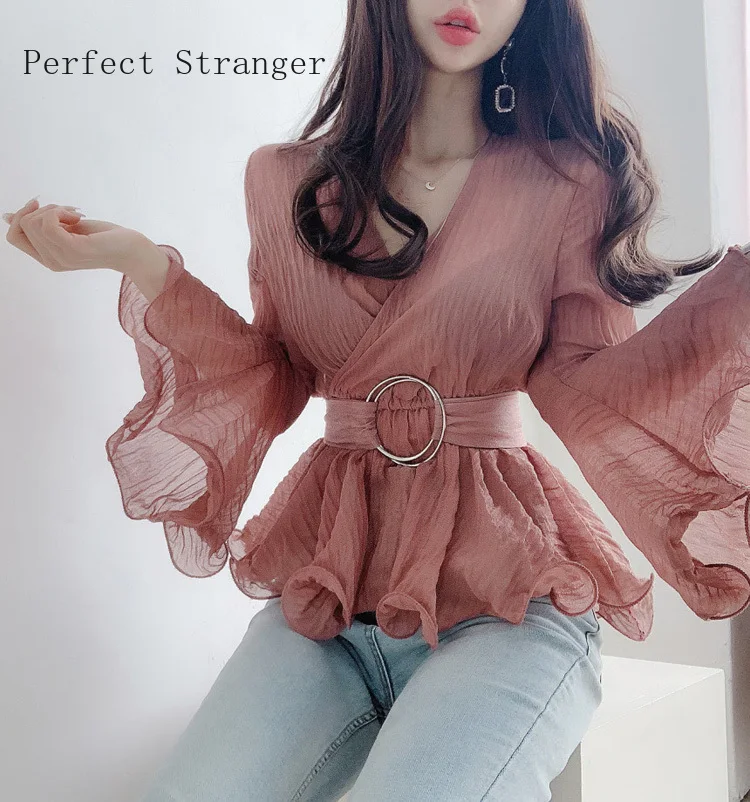 2019 осень Новое поступление Мода V воротник гофрированные расширяющиеся книзу рукав женская шифоновая блузка