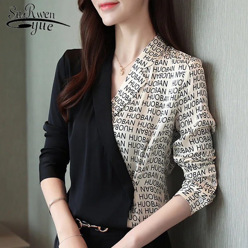 2019 шифоновые осенние женские Топы с длинным рукавом, женские топы, блузки, рубашки для женщин, с v-образным вырезом, на пуговицах, с буквенным ...