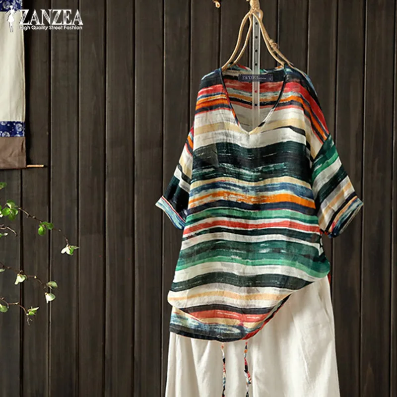 Туника оверсайз Женская полосатая блузка 2020 ZANZEA летние топы с принтом повседневные блузы с v-образным вырезом Женская рубашка с коротким рукавом Сорочка 5XL