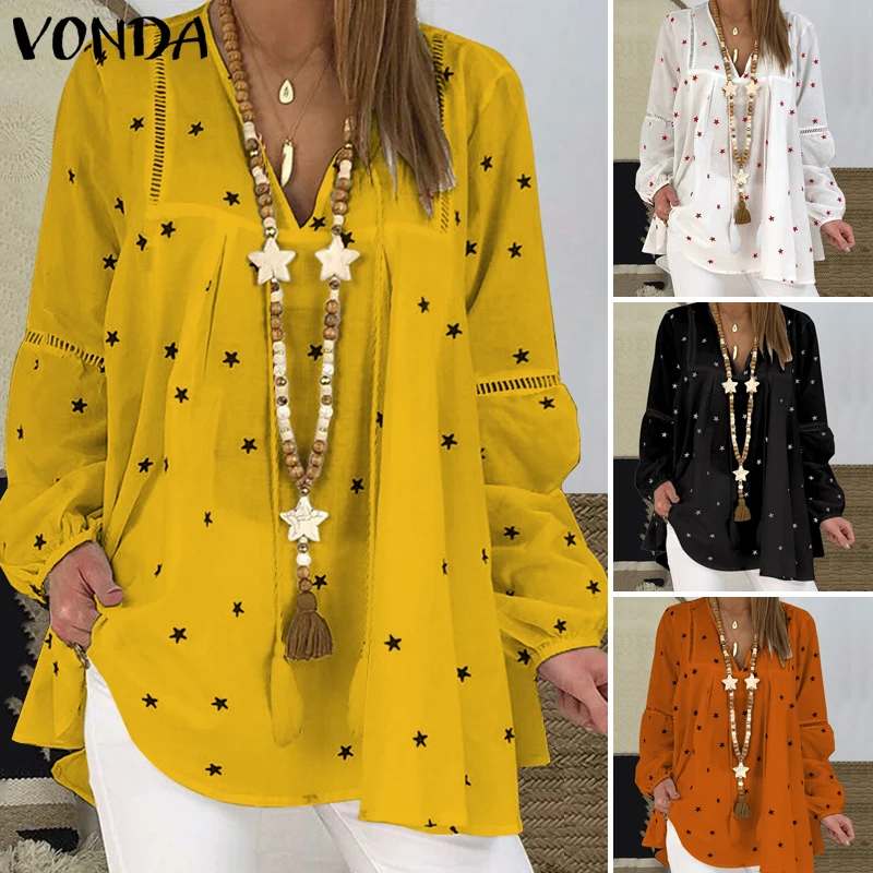 Женская блузка размера плюс VONDA 2020, винтажные топы с v-образным вырезом и принтом звезды, Осенние рубашки с длинными рукавами-фонариками, пляжные Повседневные Вечерние Блузы