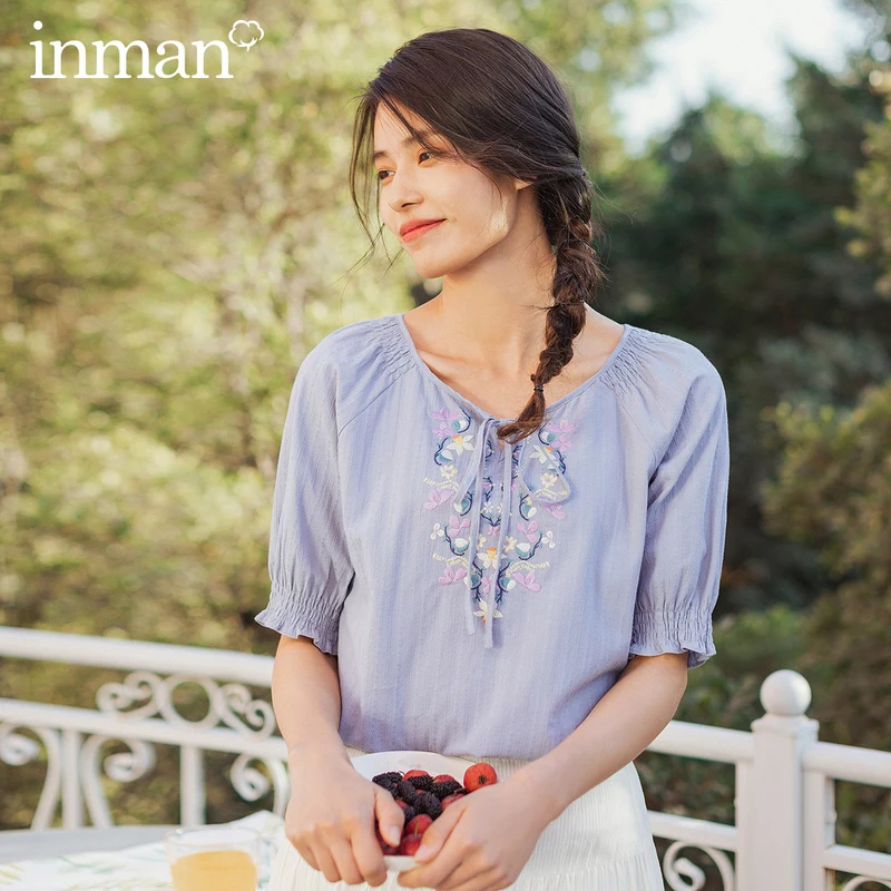 INMAN 2020 г.; летнее Новое поступление; милый пуловер из чистого хлопка в стиле ретро с вышивкой и бантом; блузка с короткими рукавами