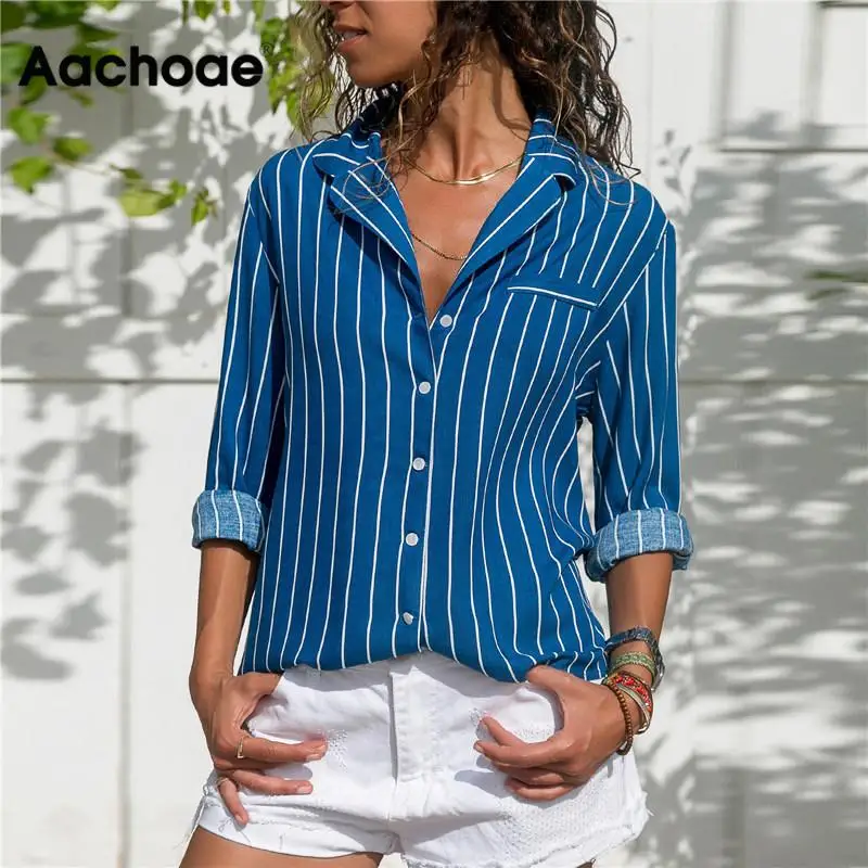 Полосатая блузка 2019 Женские топы и блузки с длинными рукавами Женская Офисная рубашка с длинным рукавом полосатая блузка рубашка плюс разм...