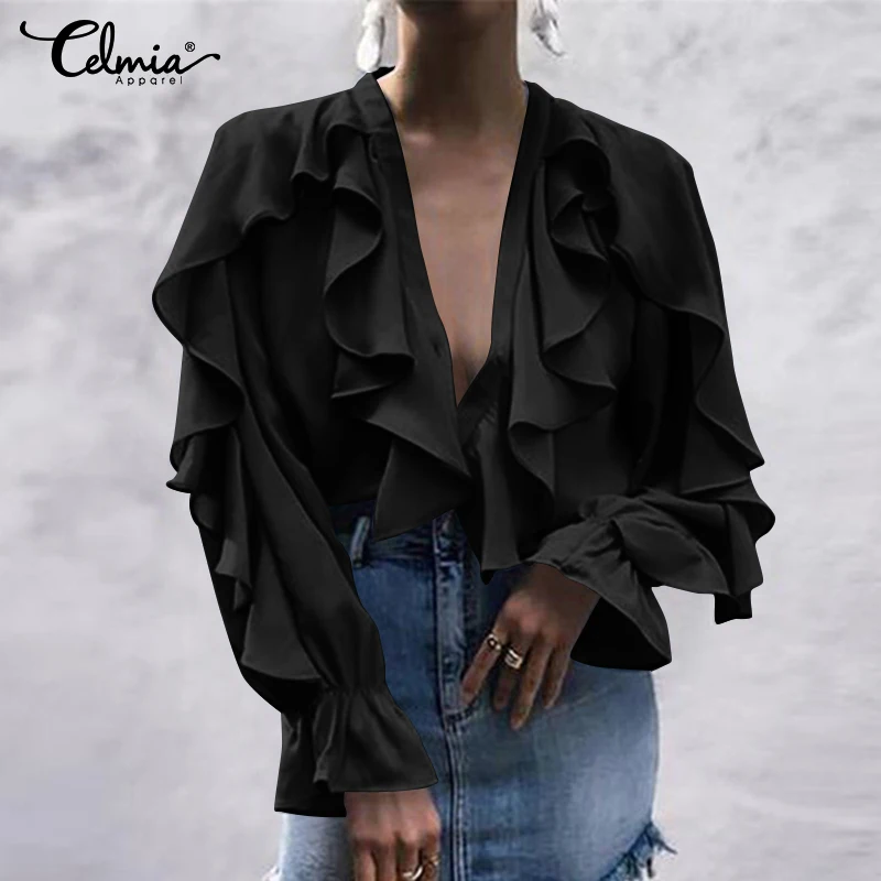 Женская блузка, рубашка, сексуальная, v-образный вырез, длинный рукав, Женская Повседневная рубашка с оборками, на пуговицах, уличная блуза, п...