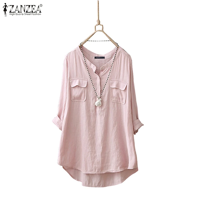 ZANZEA, женская блузка, 2020, винтажная, офисная, для девушек, для работы, OL, рубашка, Повседневная, свободная, однотонная, Blusas, весна, осень, хлопок, туника, Chemiser Mujer