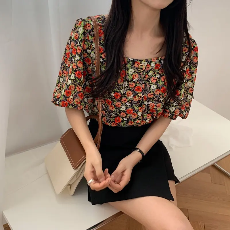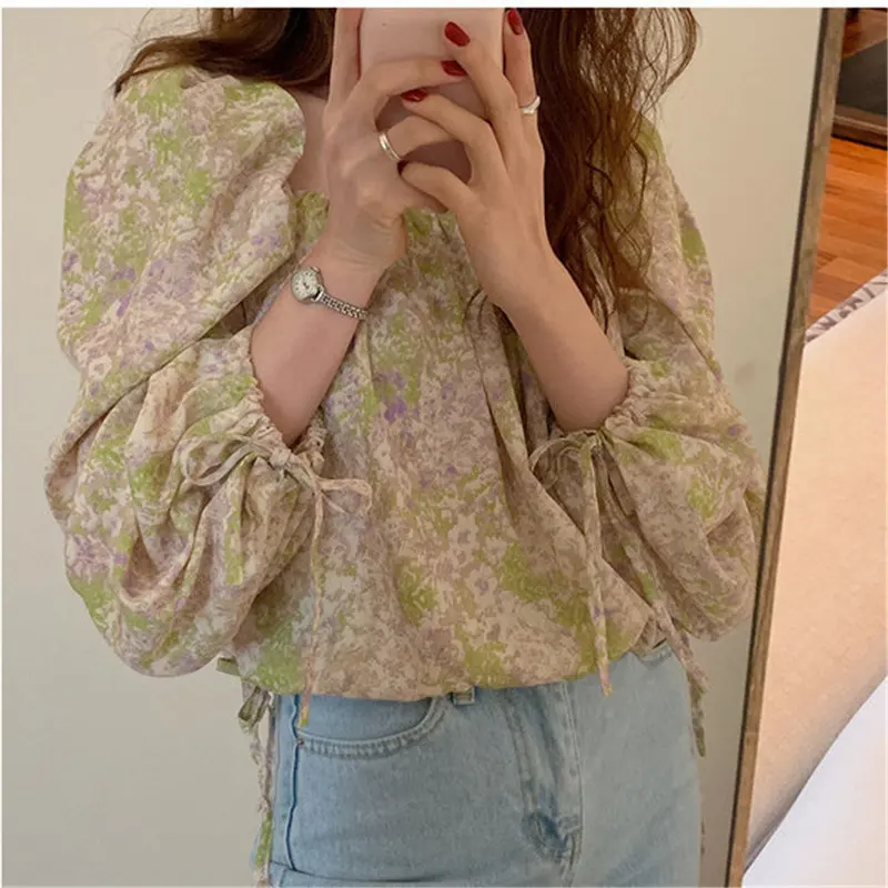 Alien Kitty ретро дворец картина маслом стиль лето нежный женский сладкий 2020 горячий квадратный воротник тонкие пышные рукава цветочные рубашки