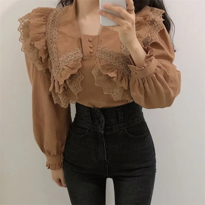 2020 Горячая Распродажа, милые повседневные кружевные блузки с рюшами, милые, милые, универсальные, стильные блузки, свободные, офисные, женские топы