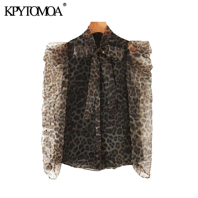 Винтажные сексуальные блузки из органзы с леопардовым принтом для женщин 2019 Модные женские рубашки с воротником-бабочкой и пышными рукавам...
