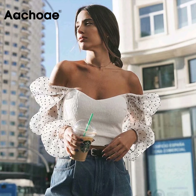 Летние сексуальные блузки с открытыми плечами Женские топы и блузки повседневные рубашки с пышными рукавами женские элегантные облегающие Топы