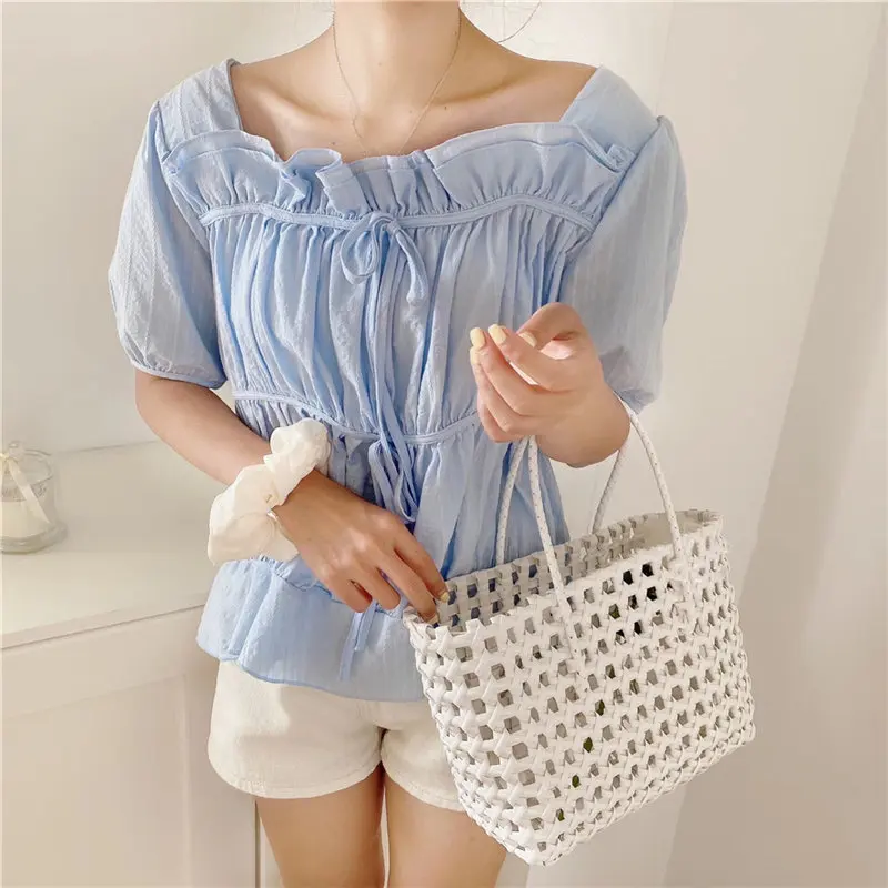 Alien Kitty 2020 летняя новая однотонная винтажная Милая приталенная плиссированная рубашка в стиле ретро с квадратным воротником, свободные тонкие топы, блузки