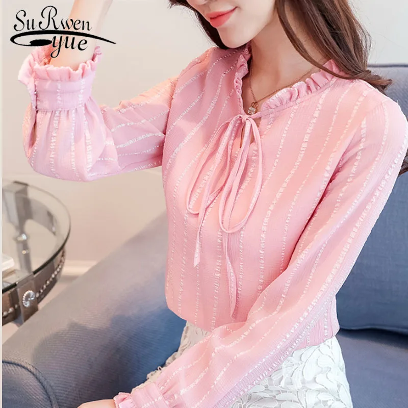 2019 осенне-весенние модные женские шифоновые блузки с длинным рукавом с оборками и воротником, повседневная женская одежда с бантом в полоск...