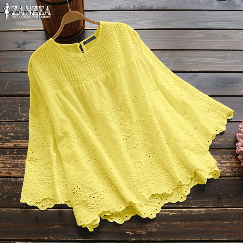 Женская Осенняя блузка 2019 ZANZEA элегантные кружевные Топы повседневные плиссированные блузы женские полые 3/4 рубашки с рукавами плюс размер туника 5XL