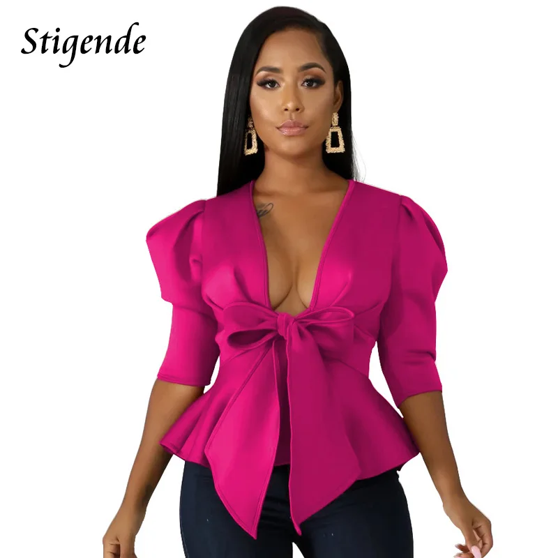 Женская блузка, сексуальная, на шнуровке, полый стильный Топ, осень 2019, рукав-фонарик, повседневная, офисная, для девушек, рубашки, блузы размера плюс