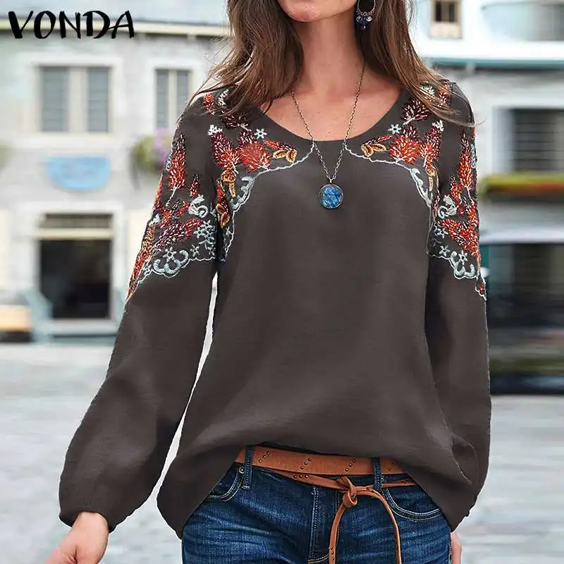 VONDA, S-5XL, Осенние блузки, для женщин, с круглым вырезом, с длинным рукавом-фонариком, вечерние, винтажные, с принтом, весенние топы, негабаритны...