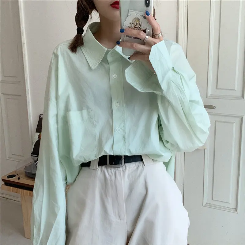 Hzirip свежие женские зеленые повседневные одноцветные короткие девушки 2020 универсальные осенние шикарные высококачественные стильные офисные женские свободные рубашки