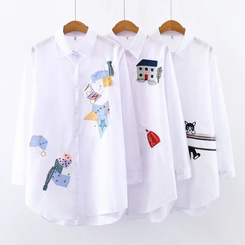 Весенняя женская блузка с мультяшной вышивкой, рубашка 2020, Повседневная белая блузка с длинным рукавом, женские длинные офисные топы размера плюс, хлопковая рубашка