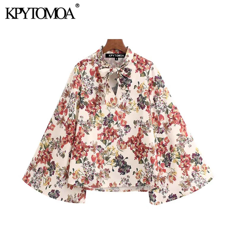 Винтажные элегантные женские блузки с цветочным принтом 2020, модные женские рубашки с воротником-бабочкой и расклешенными рукавами, шикарны...