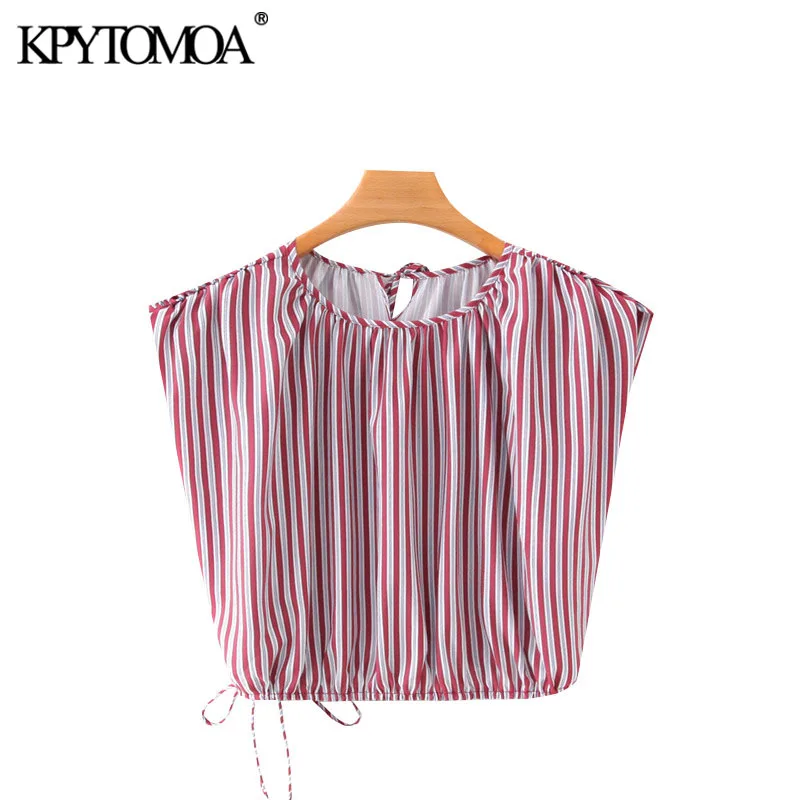 KPYTOMOA Женская мода 2020 полосатые укороченные блузки винтажные с круглым вырезом без рукавов с завязками на завязках женские рубашки Blusas шикарные топы