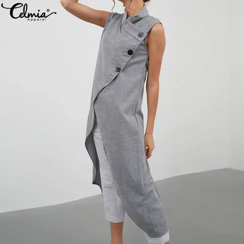 2019 Celmia для женщин рубашка в стиле ретро асимметричный верх Лето рукавов и пуговицы подпушка повседневное свободные разделение длинная руба...