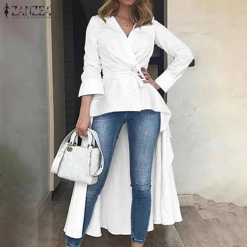 ZANZEA, сексуальные Блузы с v-образным вырезом, рубашки для женщин, с длинным рукавом, асимметричный подол, топы, Blusas, для девушек, офисная работа...