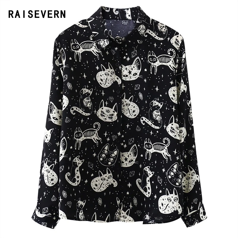 Новинка весны 2020, женская блузка с милым рисунком кота, длинный рукав, блузка, рубашка, топы с отложным воротником, белые, черные, Blusas Feminina, Прямая поставка