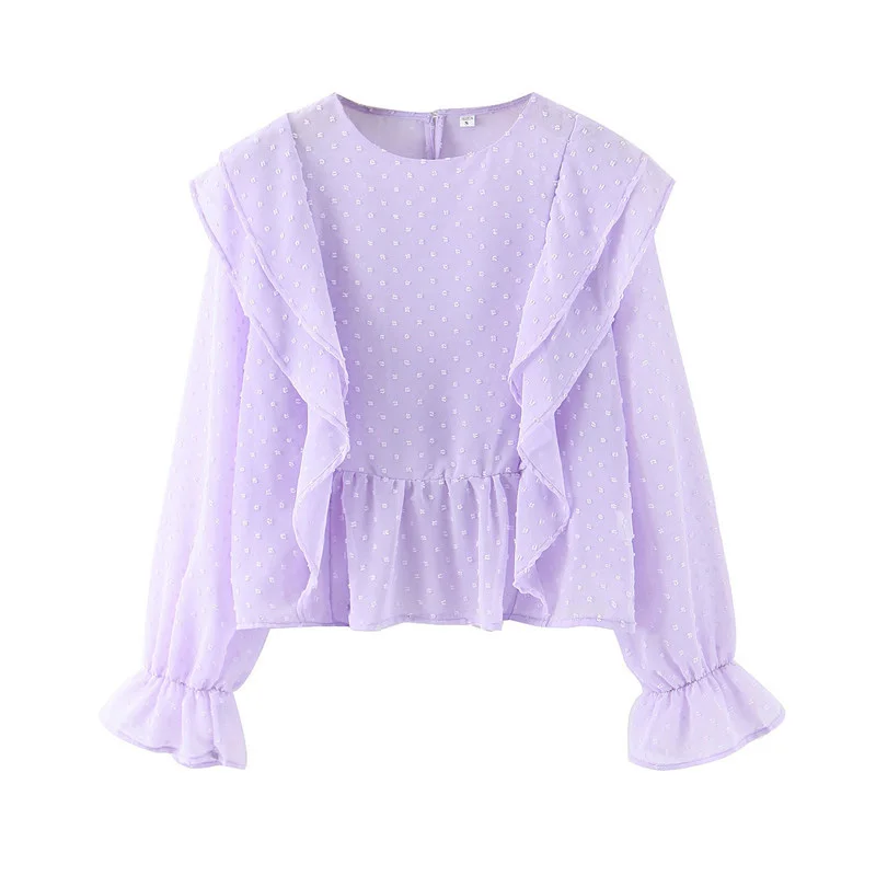 Стильные фиолетовые гофрированные шифоновые блузки в горошек Женские винтажные рубашки с круглым вырезом и длинным рукавом женские блузы шикарные блузки женские 2020